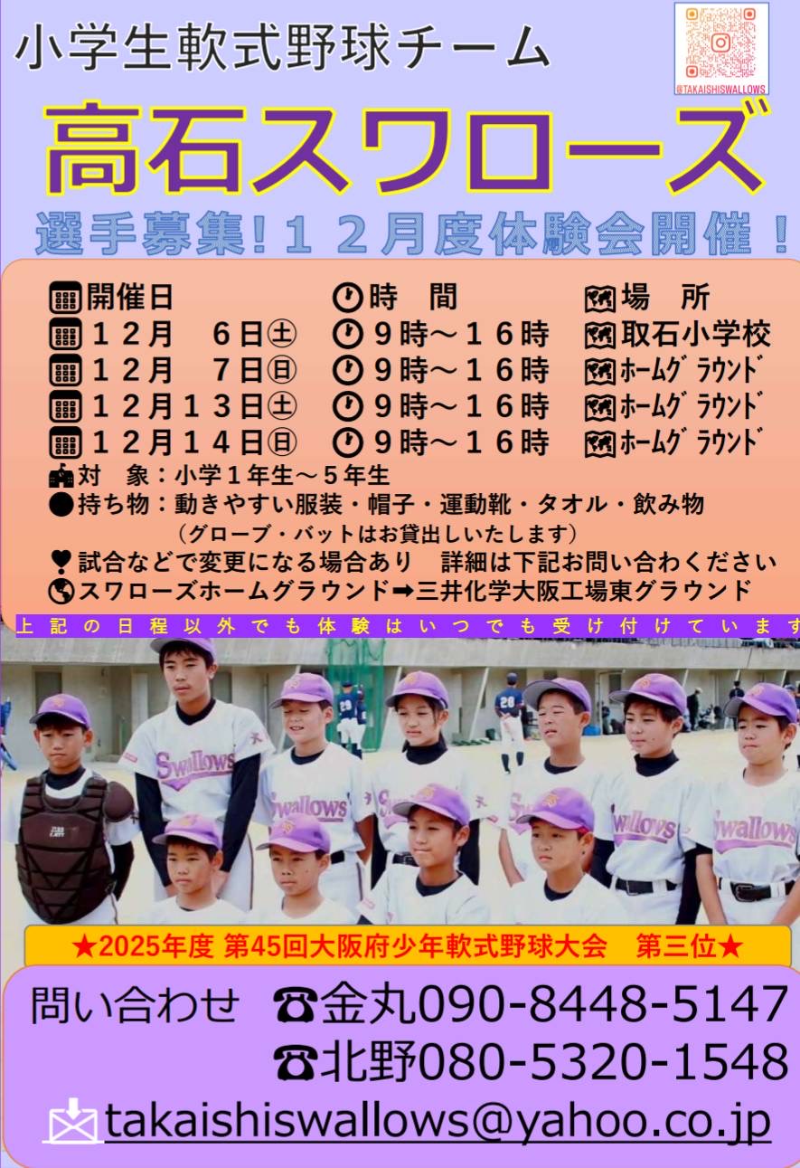 連絡先:北野 080-5320-1548 メール:takaishiswallows@yahoo.co.jp